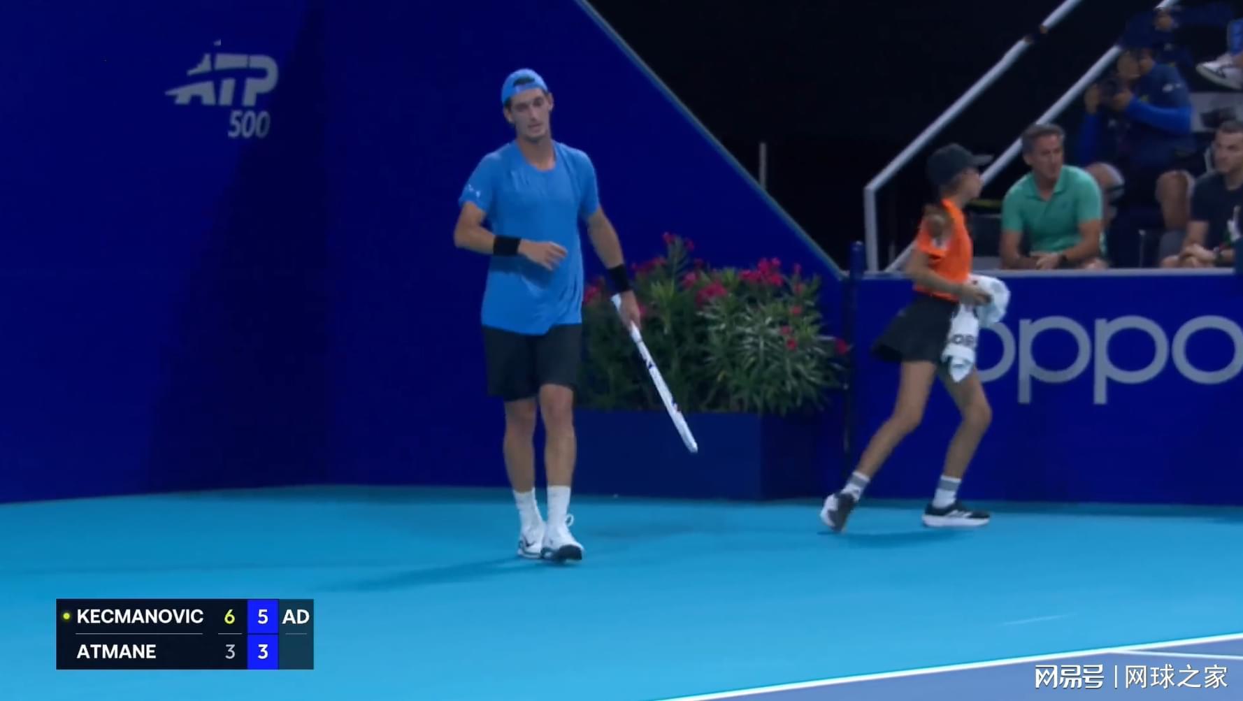 接发球的阿特马内以15-40落后,在挽救了2个赛点后两度将比分推进到局末平分deuce。凯兹曼诺维奇拿到第4个赛点时,他做好了发球准备,但阿特马内动作缓慢,迟迟没有做好接发球准备。